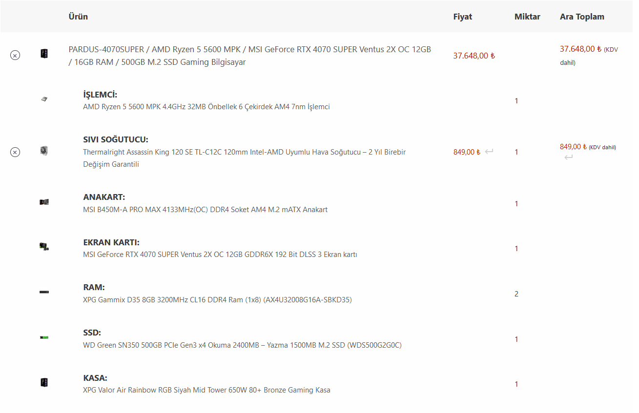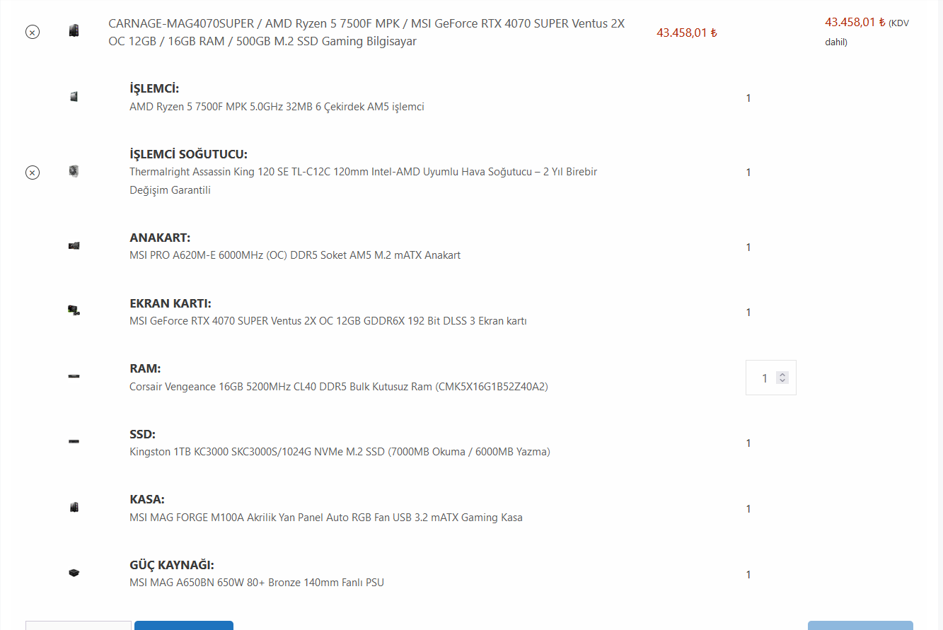 - Anakart: Asus Prime B650M-K 6400MHZ AMD AM5 DDR5 | CPU: AMD Ryzen 5 7500F | GPU: INNO3D RTX4070 SUPER TWIN X2 12GB | RAM: XPG 32GB (2x16GB) Lancer DDR5 6000MHz CL30 | SSD: Kingston Fury Renegade 1TB 7300/6000 | PSU: XPG KYBER 80+ 750W | Kasa: XPG K MESH RGB | Soğutma: DarkFlash DarkAir Plus x2 Hava Soğutma | Mouse: Steelseries Rival 600 | Klavye: E-Yosoo Z19 Mekanik Red Switch | Kulaklık: Hyper X Cloud 2 |Monitör: Dell G2724D 27 1ms QHD IPS 165hz