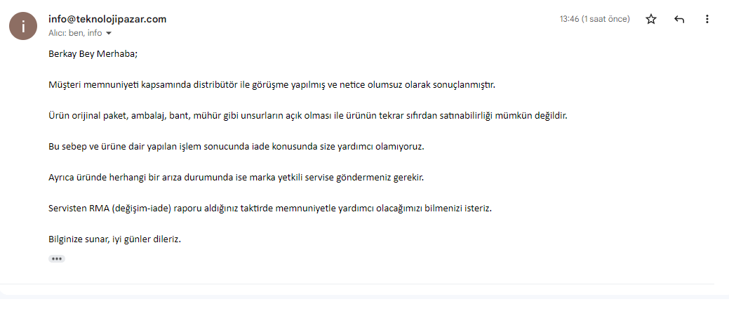 Birkaç gün önce Teknolojipazar.com adlı siteden 900 TL değerinde bir güç kaynağı sipariş etmiştim. Güç kaynağı FSP 550W FSP550-51AAC. Fotoğraflarda da gördüğünüz gibi güç kaynağının kabloları sarı lastikle ve plastik kelepçeyle bağlanmış, kutusu ise hasarlı olarak geldi. Kutusunun hasarlı olduğunu ilk kargoyu aldığım esnada fark etmedim (firma ile iade için görüştüğümde bunu fark etmememin ve kargoyu kabul etmemin benim hatam olduğunu, bunu yapsaydım bile iade değil YENİ ÜRÜNÜ kargolayacaklarını söylediler. İade etmemek için neden bu kadar fazla direttiklerini anlayabilmiş değilim). Ve kutuyu açtım, karşıma lastik ve kelepçeyle kabloları bağlanmış bir güç kaynağı çıktı, kutunun da hasarını fark etmem üzere e-posta ile derdimi anlattım. Fabrikada güç kaynağının bu halde kelepçelenmiş olma ihtimali yok, bariz kullanılmış gözüküyor. Bir gece geçti ve en sonunda distribütörle konuştuklarını, distribütörün olumsuz yanıt vermesi sonucu iade alamayacaklarını belirttiler. Birçok kez denedim, ortada bir mağduriyet var ve yasayı çiğnediklerini ve ürünü distribütörden değil kendilerinden bizzat aldığımı, distribütörün beli ilgilendirmediğini söyledim. Yani 14 gün için koşulsuz şartsız iade hakkım var ve bunu mağdur olduğum için iade etmek istiyorum keyfim için değil.