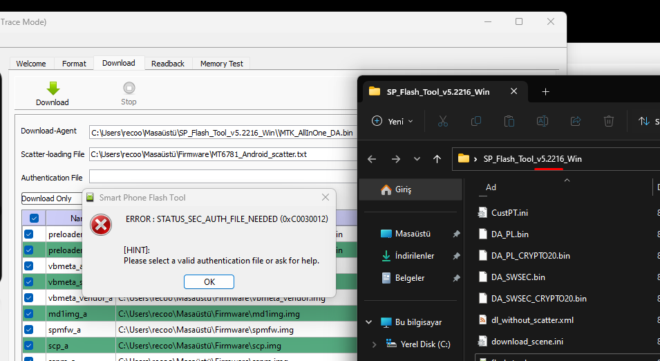 "Mtkauthbypasstool" adlı programlarla bunu atlamaya çalıştım ama olmadı. Belki de telefonun orijinal (CH7N-H812D-r-TR diye başlıyordu) romundaki boot.img dosyasını flashlarsam çözülecek ama bulamadım.
