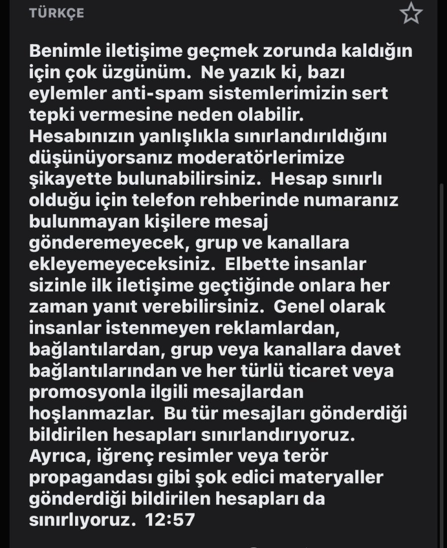 Genel gruplara mesaj göndermeniz kısıtlanmış. Arama kısmına spambot yazın, ardından botu başlatın. Ne kadar süre spam yediğiniz yazacaktır. 2 türlü spam vardır birisi genel gruplara yazma yetkisi engellenir. Diğeri PM'den Yazmak.