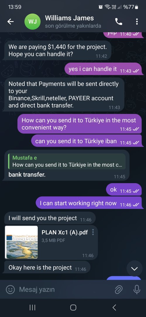 Dolandırılıyorsunuz, 36 sayfa için 1450'yi okumam dahi yetti.Merhaba, bugün bir çevirmen işi aldim ve Telegram'a yönlendirdi. 36 sayfa, 2 gün için 1450 dolar teklif etti. Kabul ettim, başlarım ancak her yerde Telegram'a yonlendirenlerin dolandırıcı olduğunu öğrendim. Hemen adama paranın guvence için Upwork'e istediğimi belirttim, kabul etti. Sizce güveneyim mi ve ilk önce adama dosyayı mi atayım yoksa adam ilk parayı mi yatıracak Upwork'e? Nasıl işliyor bu sistem?