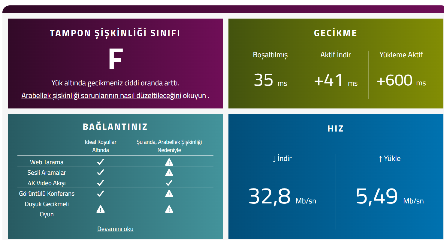 Yeni aldığım Tenda V12 AC1200 modemde Bufferbloat testleri F çıkıyor. Oyunda 50-60 pinglerden arada bir saniyelik 130'a çıkıp geri düşüyor. Bu ping artışının testte F çıkmasıyla bir alakası var mıdır? Modeme benden başkası bağlı değilken de aynı şekilde oluyor. Bildiğim kadarıyla QoS ayarı yok, bunu nasıl ayarlayabiliriz bilen varsa yardımcı olursa sevinirim.