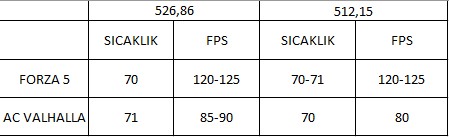 Birkaç gündür ekran kartı driver ı olarak 526.86 sürümünü kullanıyorum. Geriye 512'ye dönüp sıcaklıkları karşılaştırdım ve şu an 512.15 ile 526.86 sıcaklık olarak aynı gibi görünüyor. AC Valhalla ve Forza Horizon 5'te denedim. Sonuçları şöyle tabloladım.