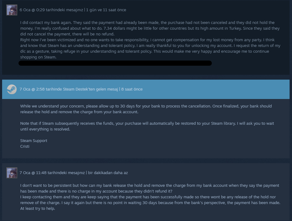 Hepiniz itiraz edin hangi banka kartıyla aldıysanız dekontunu atın Steam desteğe banka başka konuşuyor Steam başka konuşuyordünkü yazışmalarda link atmıştım onlardada aynı sıkıntı vardı onlara niye iade etti bize orta parmak göstere bileceğiniz tüm kanıtları atın desteğe benim aklıma sadece dekont geldi onu attım bir de söyle bir yazı attım siz çevirin artık.