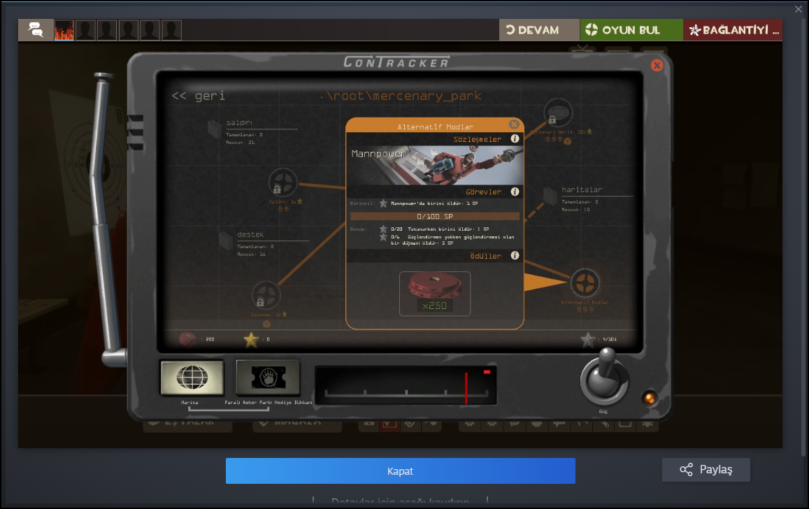 Solda kontrat ilerlemesi var. Bu kontrati bilmiyorum ama 0/100SP diyor. Mannpower modunda olman lazim 2Fort falan girmen nafile.Giriyorum ama adam öldürüyorum olmuyor.