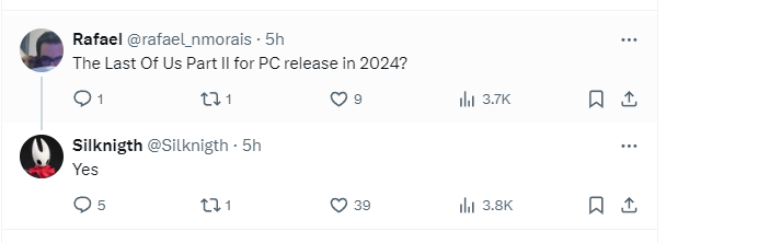 Silknight "TLOU Part 2 bu sene PC'ye geliyor mu?" sorusunu soran bir kullanıcıya "Evet." cevabını verdi.