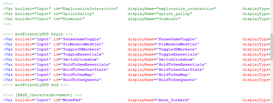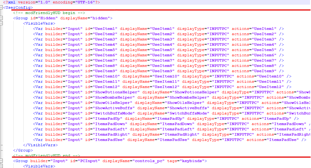 Buradaki <!-- modFriendlyHUD begin --> kısmından <!-- modFriendlyHUD end --> kısmına kadar olan kısmı, orijinal input.xml dosyamızın içindeki <UserConfig> ve <Group builder="Input" id="PCInput" displayName="controls_pc" tags="keybinds"> arasına yapıştırıyoruz. Alt kısımda bir tane daha var.