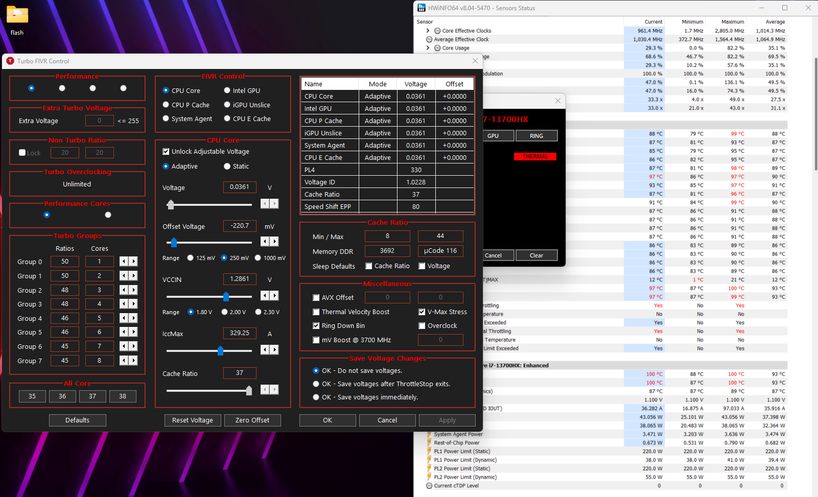 Core ve RING'de PL2 yanıp sönüyor oyunlarda ve bazen ikisinde de Thermal Event yiyorum ne yapmalıyım? BIOS ayarlarından undervolt protectionu kapatıp undervolt cpu core offseti -140 p ve e cache -110 da ama bir etki etmedi. Macunu PTM7950 ile değiştirdim ısı değerleri bir tık daha iyi şuan. Laptop daha 1 aylık aldığımdan beri ısı sorunu var eskiden EDP Other da yanıyordu şimdi hiç yanmıyor(MUX Switch'den dGPU'ya geçtiğim için olabilir). PL2 limiti şuan 220W