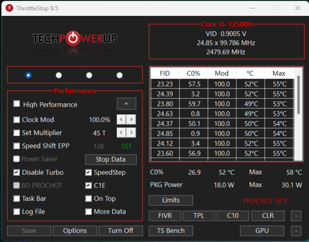 Cihazım laptop olduğundan dolayı Intel Turbo Boost'u BIOS'tan da güç ayarlarından da kapatamıyordum. ThrottleStop üzerinden Turbo Boost'u kapatabildiğimi öğrendim ve kapattım.