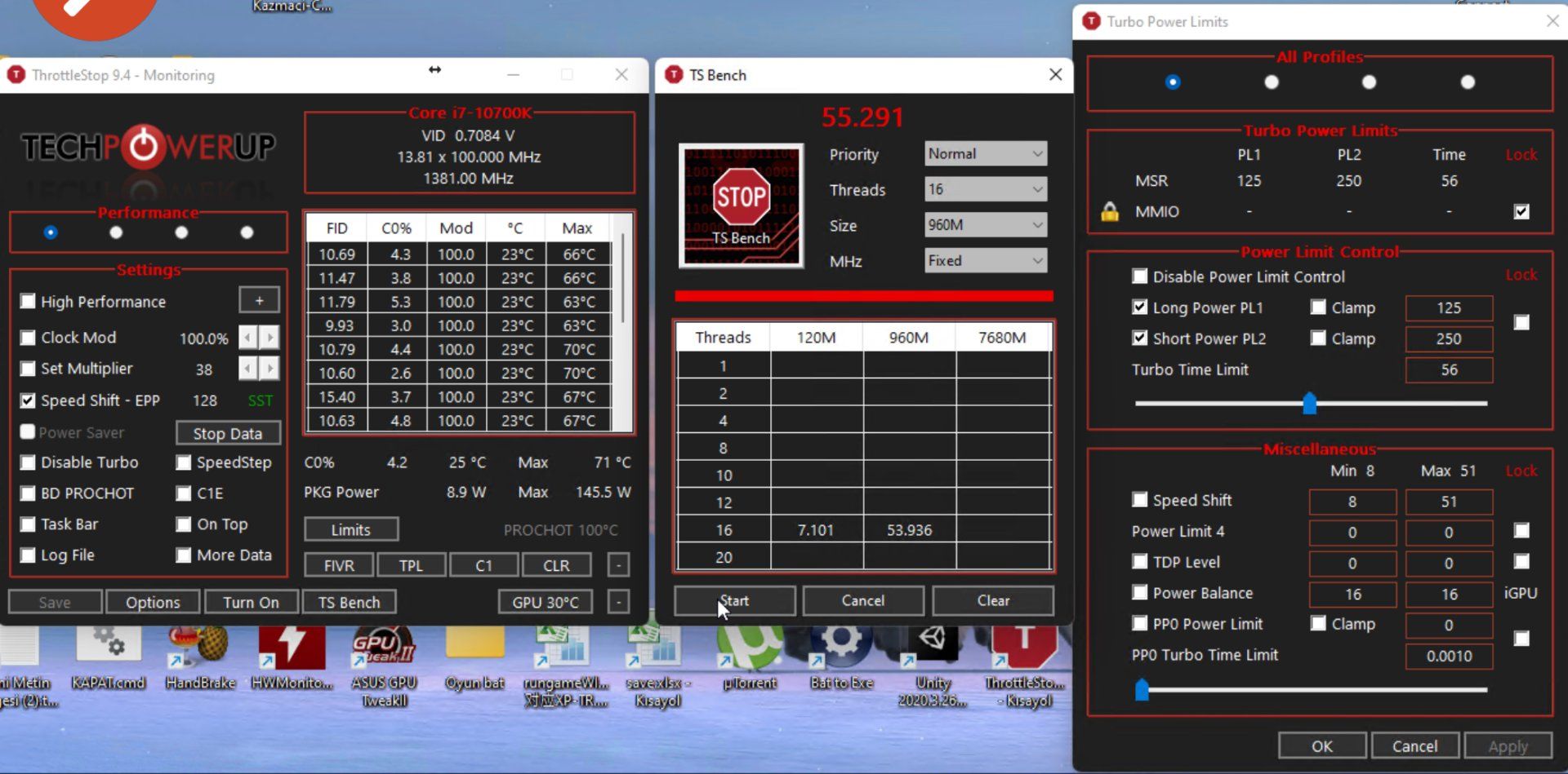 Her arttırmadan sonra ThrottleStop Ana Ekranındaki TS Bench aracını kullanıyoruz. Start'a basıyoruz ve testin bitmesini bekliyoruz. Test bitince eğer ekranda "xyz Error" görürseniz zaten şimdi ne yapacağınızı anlatacağım.