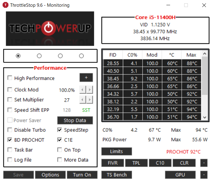 Yapılabilir Ayar 1: Bazı sistemlerde nedeni belirsizdir çekirdek ve işlemci kullanımı sınırlandırılır. Sınırlama olup olmadığına bakmak için ThrottleStop Ana Ekranındaki tabloya bakın. Oradaki Mod değeri eğer 100 değil ise Settings kısmındaki Clock Mod kutusunu tikleyin ve 100 olarak ayarlayın.