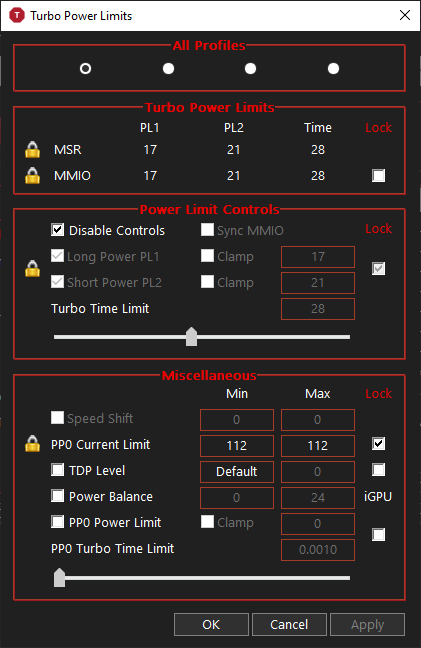 Yapılabilir Ayar 9: Hemen tablonun altında "Disable And Lock Turbo Power Limits" diye bir kutu var. Bu kutuyu işaretleyin. Bu ikincil turbo güç limitlerini (MMIO) devre dışı bırakır ve bir çok güç yetersizliği sebebiyle frekans kısılması sorunun üstesinden gelebilir. Rahatlıkla işaretleyin.