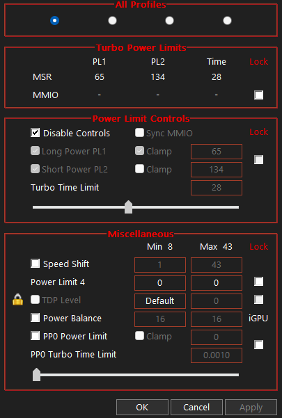 Yapılabilir Ayar 9: Hemen tablonun altında "Disable And Lock Turbo Power Limits" diye bir kutu var. Bu kutuyu işaretleyin. Bu ikincil turbo güç limitlerini (MMIO) devre dışı bırakır ve bir çok güç yetersizliği sebebiyle frekans kısılması sorunun üstesinden gelebilir. Rahatlıkla işaretleyin.