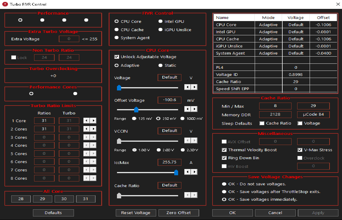 Sistemimiz için uygun Offset Voltage değerlerini bulduktan sonra FIVR sekmesinde şuradaki gibi ayarlayın. Apply'a basın.