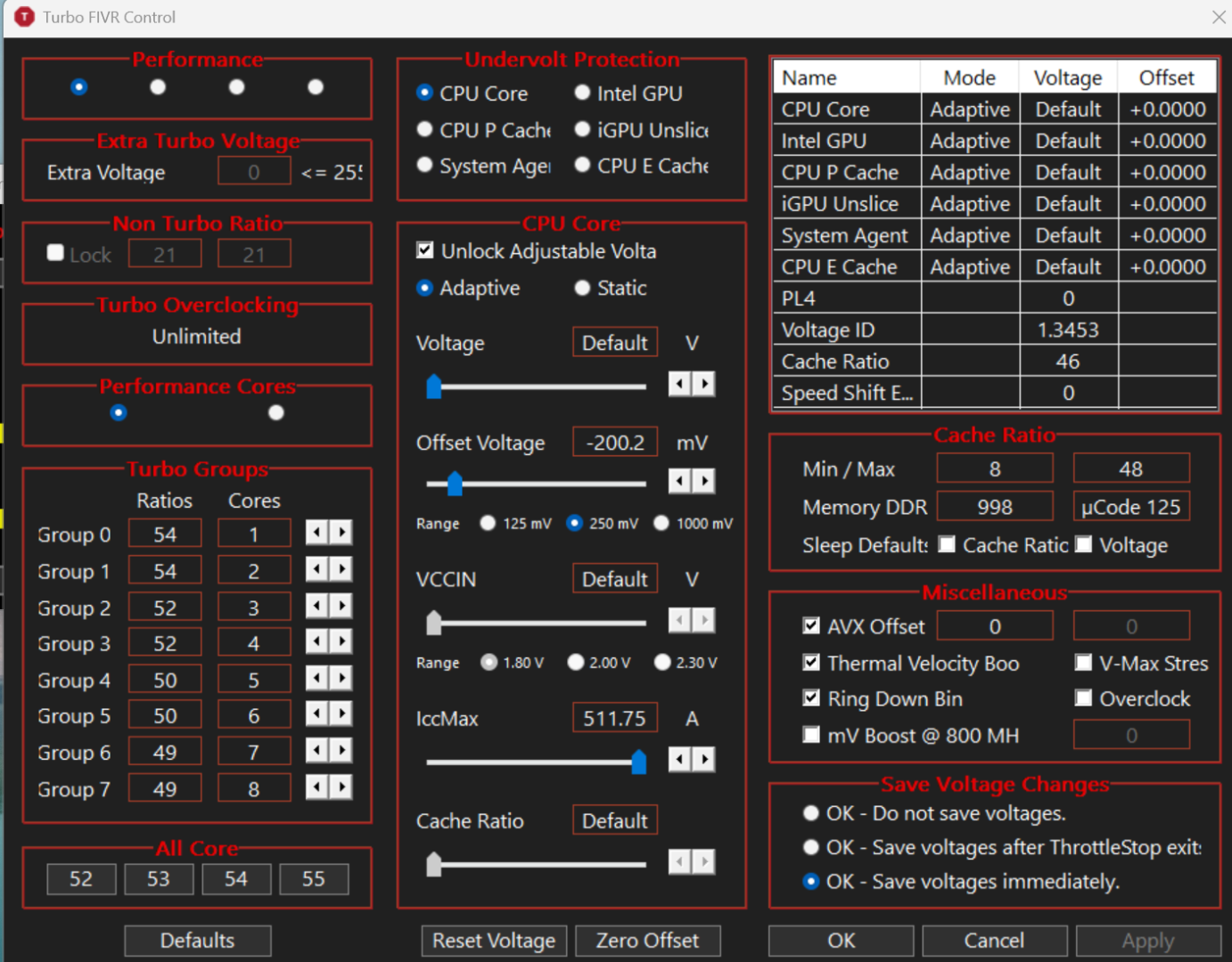 yapılabilir ayar 9: hemen tablonun altında "disable and lock Turbo Power limits" diye bir kutu var. Bu kutuyu işaretleyin. Bu ikincil Turbo güç limitlerini (mmıo) devre dışı bırakır ve birçok güç yetersizliği sebebiyle frekans kısılması sorunun üstesinden gelebilir. Rahatlıkla işaretleyin.