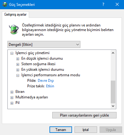 Bu yoksa eğer güç seçenekleri>plan ayarlarını değiştir>gelişmiş güç ayarlarını değiştir>işlemci güç yönetimi>işlemci performansını artırma modu oradan açıp kapayabilirsin.