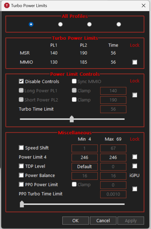 Power Limit 4'te sağdaki kutuya 0 değerini girin. Apply'a bastığınızda soldaki de 0 olabilir önemli değil.