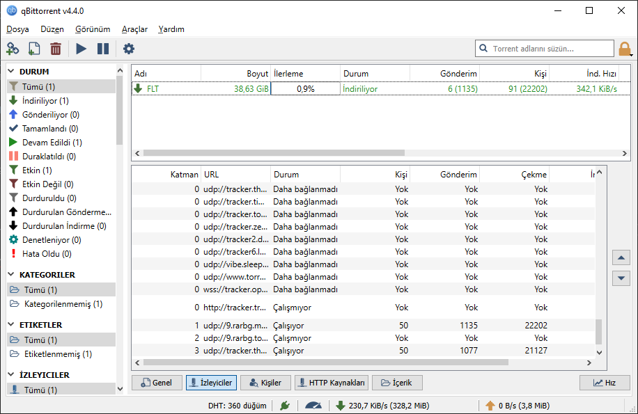 qBitTorrent'ten bir dosya indirirken çok yavaş indiriyor. Güncel trackerlar attım şu an en fazla 400 KB oldu arada 1MB'ye çıkıp iniyor.