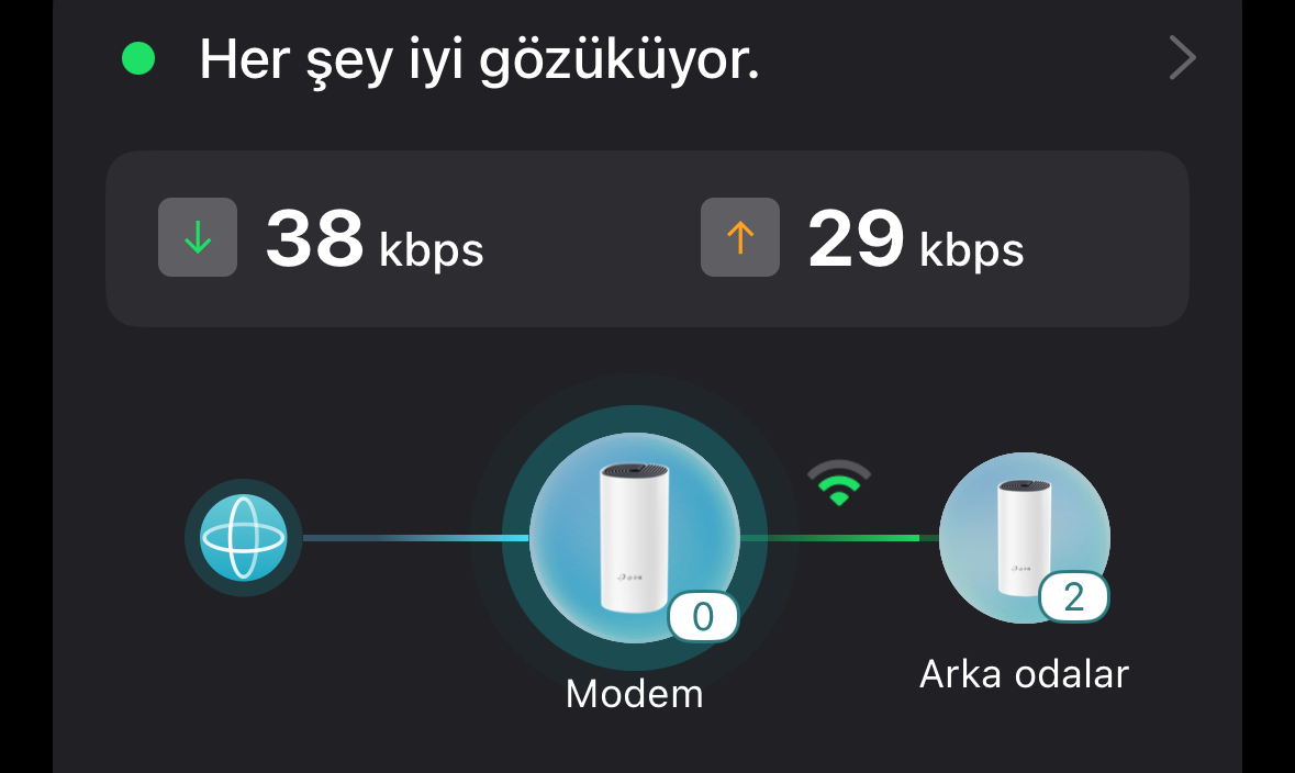 Türk Telekom 200Mbps fiber internet kullanıyorum. Modemin bulunduğu odadayken tam verim 200 Mbps alıyorum ancak diğer odalarda düşük hızdan öte direkt bağlantı sorunu yaşıyorum. Bu soruna çözüm olması adına TP-Link Deco E4 2'li modelini aldım. Birini kabloyla modeme bağladım birini de başka bir odaya taktım. Doğrudan modeme bağlı olan cihaza bağlanınca maksimum 90 Mbps alabiliyorum diğer eşleştirdiğim modelde ise en fazla 30 Mbps alabiliyorum. Bu değerleri almam normal mi yoksa cihazlarda bir sorun mu var çözemedim.
