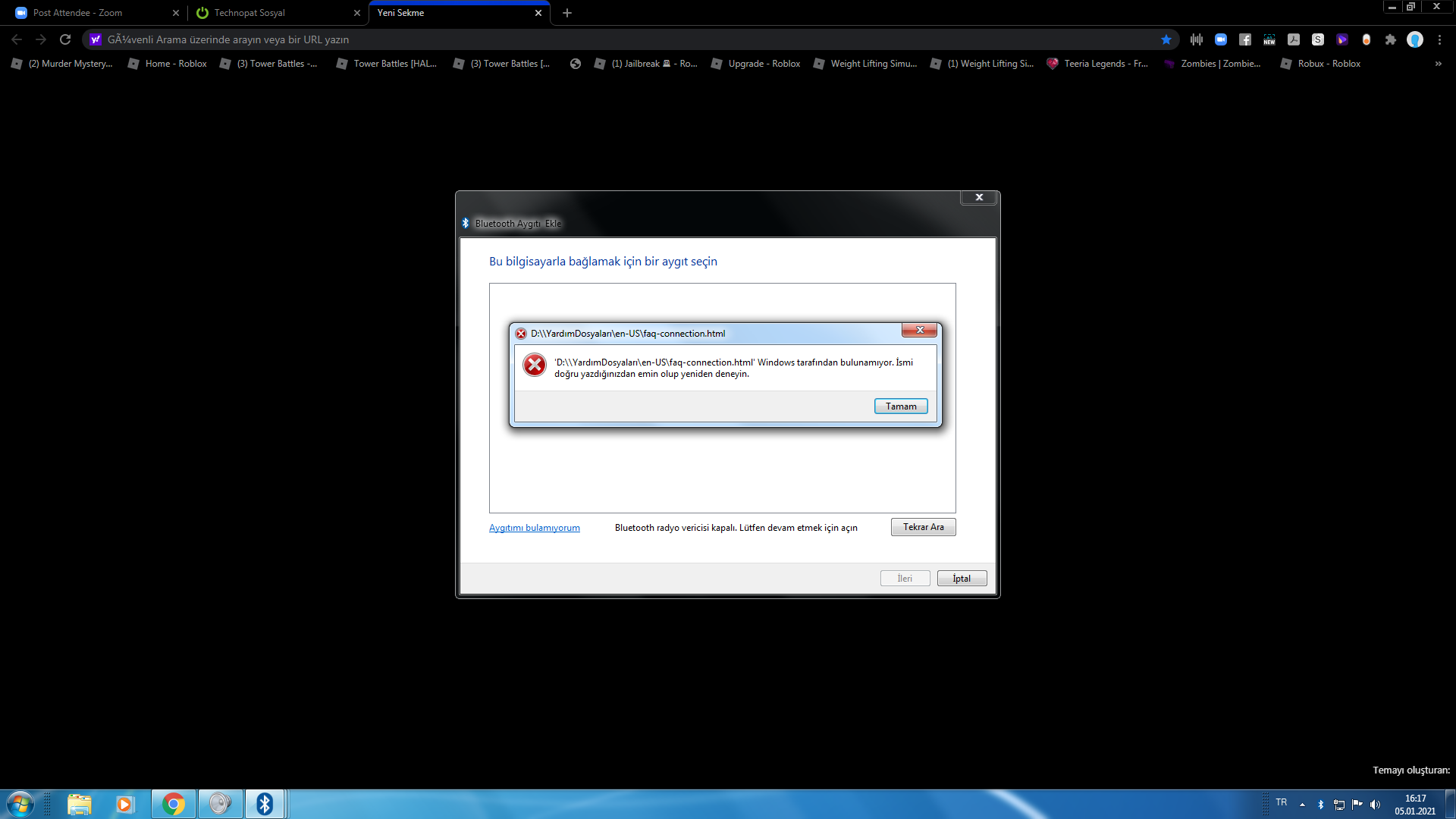 Düzenleme: Aygıt yöneticisi ile açıp kapattım. Bluethooth simgesi göründü ancak cihazı bağlamak istediğim zaman bu hatayı veriyor.