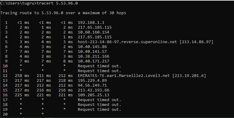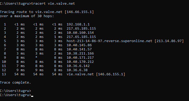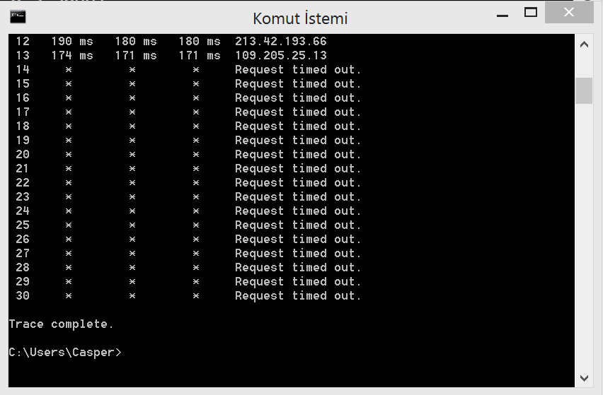 Tracert komutunun amacı bir sunucuya giderken internetinizin vardığı kaç tane aktarma noktası olduğunu ve aktarma noktalarına olan gecikme süresini görmektir kısaca. Sizden istediğim bu 5 sunucudaki tracert sonuçlarınızı paylaşmanız. Nasıl yapılacağına gelirsek başlat kısmına "CMD" yazıyoruz. Ve aşağıdaki IP'leri "tracert IP" şeklinde yazıyoruz. Biraz bekledikten sonra,