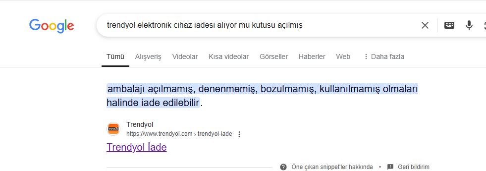 Bu konuda iade için kendilerine gönderdiğinizi ve servis tarafından iadeye uygunluğunun kontrol edilmesini istediğinizi kendilerine iletebilirsiniz. Kullanımına engel olan veya kozmetik hiçbir sorunu olmadığı sürece bu iadesine engel olmayacaktır. İkinci el durumuna düşmesi cayma hakkını elinizden alan geçerli bir sebep değil. İade göndermeniz halinde size geri dönerse bunu teslim almak ile yükümlü değilsiniz. THH dosyanıza bu durumu da iletebilir, Trendyol'a bunu belirterek baskı yapabilirsiniz.