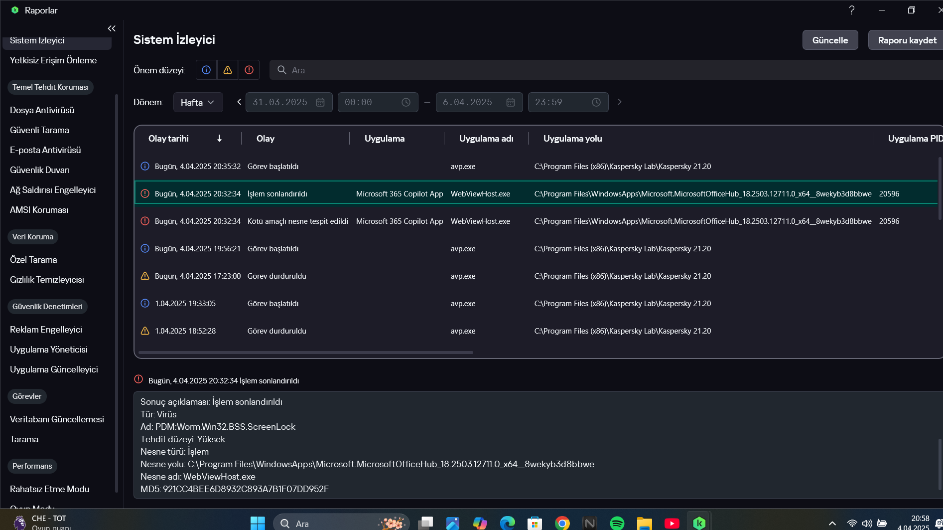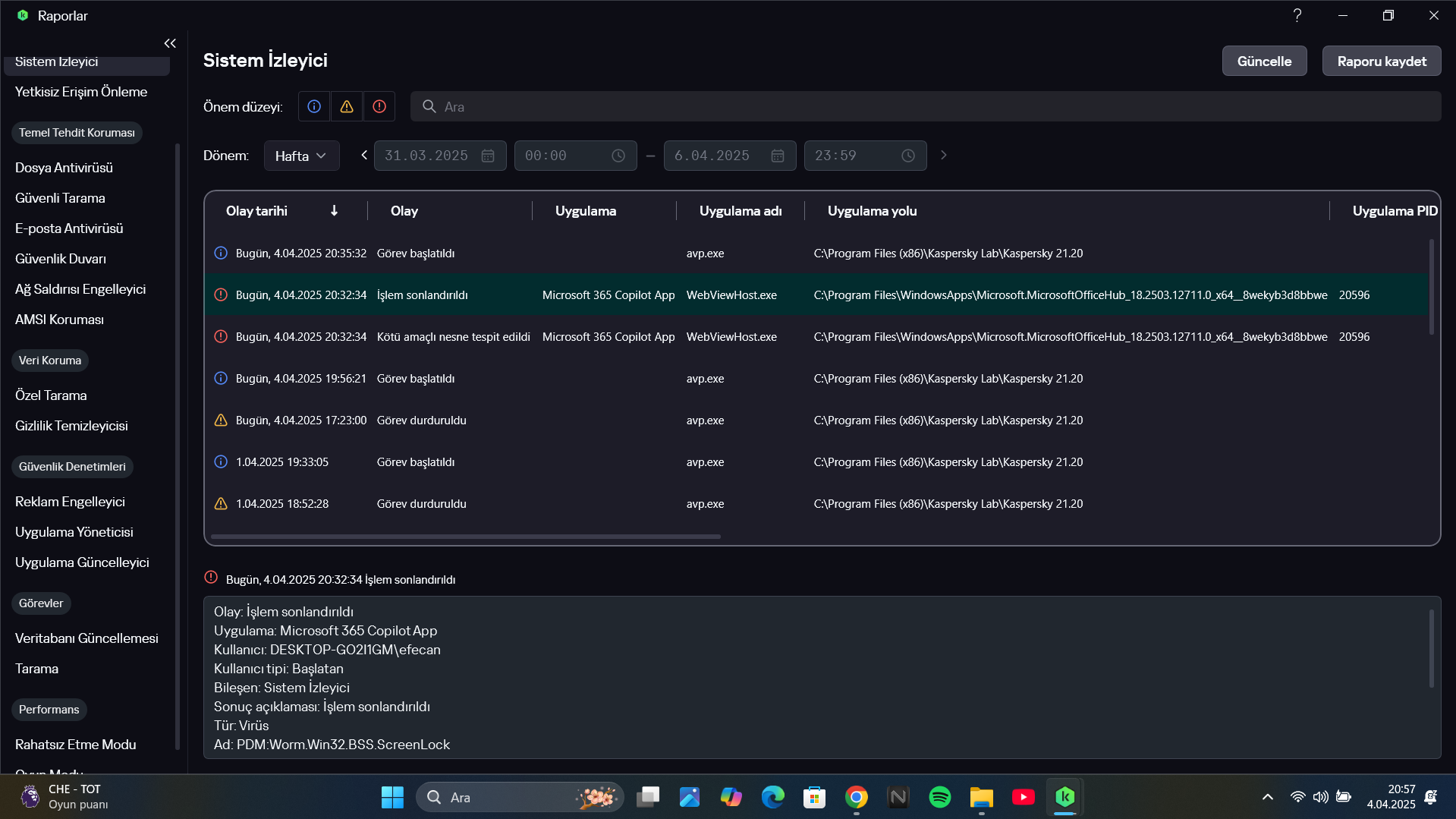 Yani turuncu uyarı verse virüs olabilecek ama şuanlık virüs belirtisi göstermeyen manasına geliyor ama senin uyarı kırmızı yani virüs olması lazım. Birde benim anlamadığım Copilot ile birlikte Kaspersky Lab'a da uyarı vermiş çok garip gerçekten