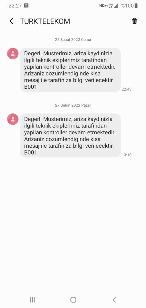 Türk Telekom resmen beni oyalatıyor. Sokaktaki kabloların çalışmasında ben sorumlu değilim. Ben hizmet almak istiyorum. 11 gündür İnternet yok. Kısıtlı kısıtlı mobil verinden avutmaya çalışıyorum o da nereye kadar? Bir de üstünde kotalı şimdi bitse ne olacak? Bir de utanmadan kaç gün sonra faturada yollayacaklar, kullanmadığım İnternet parası alacaklar. Rezillik resmen! Beni arıyorlar, 30 Nisanda yapılacakmış 11 artı 30 eşittir 41 gün ediyor insanı bir kablo bu kadar mı uzun sürüyor? Mağdur etmeye ne hakkınız var? Kablo yoksa sipariş et o kabloları yüksek yere at önlemini al. Hırsızların ekmeğine yağ sürüyorsun, bir de çıkıp büyüdük böyle olduk şöyle olduk diye övünürler. Kardeşim yıl olmuş 2022 yahu direklerden İnternet almaya çalışıyoruz. Fiber optik yapsana. Saha dolabı olsa hırsız çalamaz kilitlersin olur biter. Resmen diyorsun hırsız gel çal. Hayatımda böyle bir şey görmedim. Sorumsuzluk, ne desen var. 11 gündür bu mesajları atıp duruyorlar hepsini sildim. Mesaj atıyorlar başka bir şey yok.