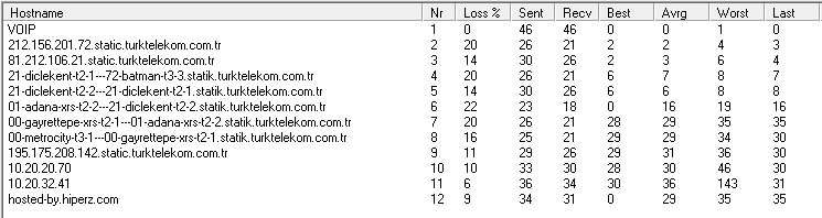 Bu problemden bıktığım bir gece bu anı yaşadığım anda TTNET'i aradım, sinyallerimde bir problem olmadığını söyledi. Modem resetlediler falan filan her şeyi yaptılar ve problem görükmediğini söylediler. Modemin yeri, işte elektronik cihazlara yakınlığı vs gibi biiiiiir sürü şey konusunda ikaz edip kapattılar. Az önce de yine aynısı oldu, modem arayüzünde "IP & etki alanı testi" diye bir başlık gördüm, bağlandığım serverın IP'sini girdim ve değerler alttaki resimde verdiğim gibiydi.