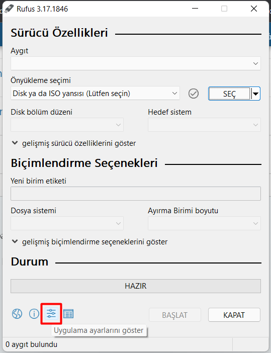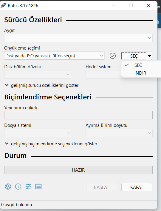 Şimdi Rufus'u kapatıp açıyoruz. Buradan indiri seçiyoruz. Ardından tıklıyoruz.
