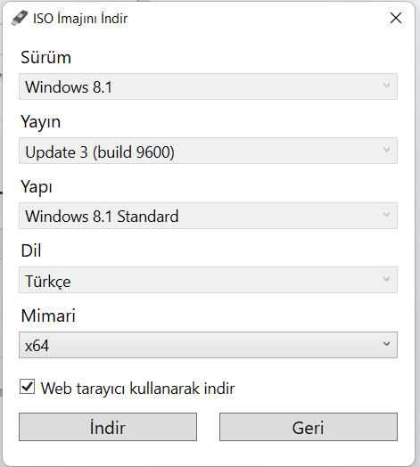 IDM ile indirmek istiyorsanız "web tarayıcı kullanarak indir"'i seçin. Benim önerim Web'den yana olacaktır. İndir tuşuna basınca Microsoft sunucularından incektir.