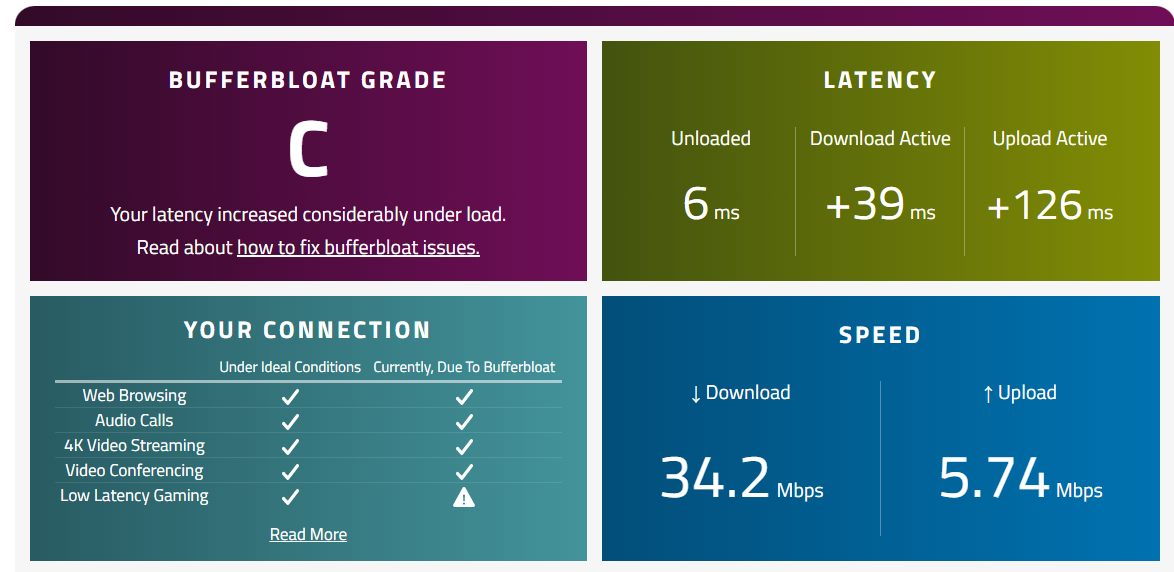 BufferBloat testimiz böyle çıktı. Müşteri temsilcimle görüştüm bana değerlerin normal olduğunu söyledi. Kanal vs. değiştirdi, modem kapattı açtı, LAN portu değiştirdik tekrar teste soktuk sonuç aynı çıktı. Ne yapmam lazım şu anda?