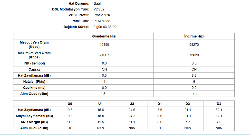 Aslında bu değerler ile sorun olmaması lazım. Tam olarak yaşadığınız sorunu anlatır mısınız? Upload tarafında hat zayıflaması bir tık fazla gibi geldi bana. DSL kablosunda ek. Vs var mı?