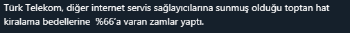 "Türk Telekom, yeni hat kiralama bedellerini eski müşterileri için düşük hızda yüzde 66, yüksek hızda ise yüzde 4.6 artırdı. Üzerine vergileri de koyunca operatörlerin yapacakları zam oranı bu rakamların çok daha üzerinde olacak. Alternatif operatörün 16 Mbps hızındaki internet için KDV dahil Türk Telekom'a vereceği para 43 TL civarında. Satarken hiç kâr etmese, başka hiçbir masrafı olmasa bile 58 TL'ye satması gerekiyor. Ancak satış, destek, altyapı masraflarını ve yüzde 25.5 KDV ve Özel İletişim Vergisi'ni koyarsanız vatandaşa satışı 80 TL'yi bulur. Bu da yüzde 86 zam demek."
