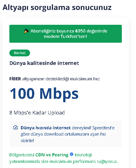 Aynı yerde TurkNet ile sorgu yapınca VDSL altyapısı sunuyor sadece.