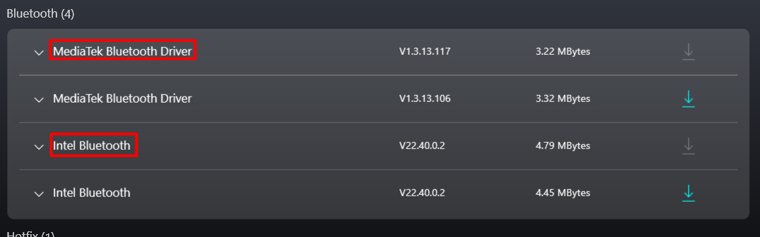 Alt tarafta driverlar çıkınca networking, chipset, Audio ve pointing Device'taki tüm driverları indir. Bluetooth'ta da aynı ada sahip olanlar için ne kadar yer kapladığına veya sürümüne bakarak yükleyebilirsin. Bende bu şekilde.