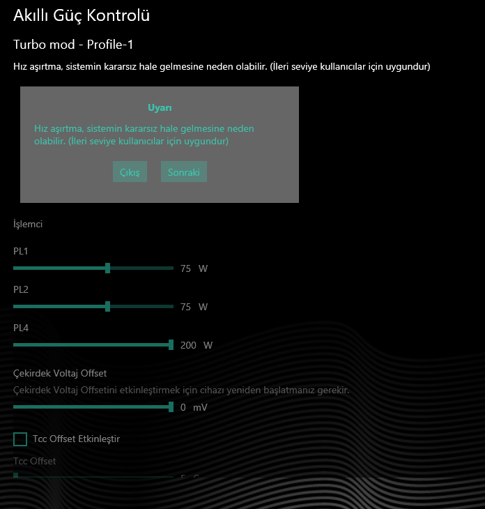 pl1 75W pl2 75W pl4 200W şeklinde. 11800h'nin max turbo frekansı 4.6 ghz. 6ghz'ye çıkması teknik olarak mümkün değil. Şayet cihazı yeni aldıysanız dynamic boost 5W şeklinde görünüyordur. Yani turbo moda alsanız da oyun moduna alsanızda cihaz max 115+5W güç çeker. Normalde cihazınızı her mod için bir profil ayarı yapmanız gerekiyor. Örneğin Oyun modunda (profil2 olsun) dynamic boost 10W olarak değiştirin. Turbo mod (profil3) olsun ve bunu da 15W olarak değiştirin. Böylece cihazınız her mod'da farklı performans sergiler. Turbo mod'da bu şekilde performans ihtiyacı duyduğunda 130W ve üstüne rahatça çıkar. Kısacası monster kontrol merkezini biraz kurcalayıp öğrenmeniz gerekiyor. Normalde harici bir turbo fan tuşu da var ancak dilerseniz örneğin turbo modunda fan ayarlarını (seçtiğiniz profile göre) %100 çalışmasını da sağlayabilirsiniz. Yani cihaz sizi fazlasıyla özgür bırakıyor.
