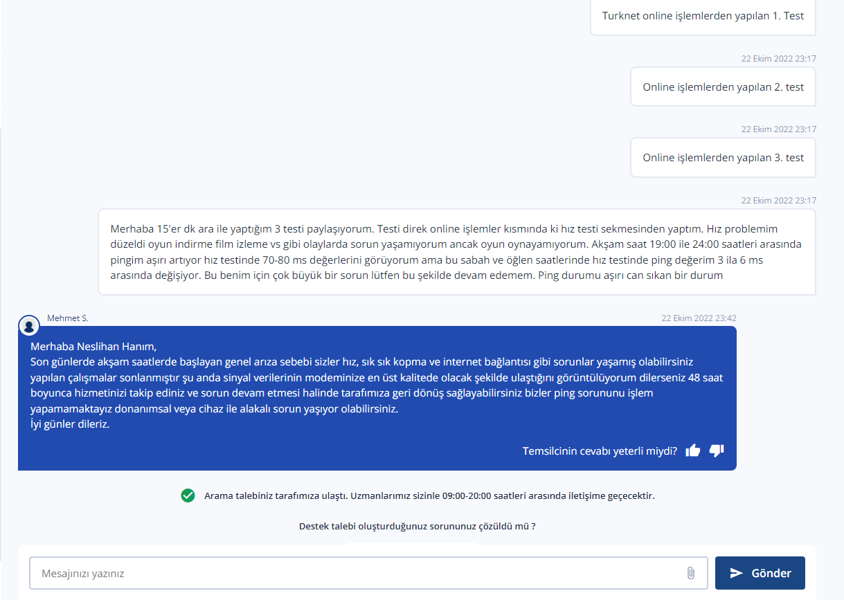 Merhaba, aldığınız ping tracert test sonuçları ile birlikte www.turk.net/oim sayfamızdan destek kaydı oluşturabilir misiniz? Uzmanımız network ekiplerimize kontrol etmesi için iletecektirTurkNet kullanıp sorun yaşamayan var mı? Güya GPON fiber kullanıyorum hız sorunumu çözdüler ancak akşam saat 19 ile 24 arasında ping değerlerim uçuyor. En basit şu an LoL oynarken pingim 3-5 arası ama akşam bu değer 60-80 arası oluyor ve oynayamıyorum diğer Online oyunlarda da aynısı var. Müşteri destek ekibi ping sorununa müdahale edemiyormuş nasıl bir sorunsa artık. Bugün sözleşmemi iptal edip Türk Telekom'a geçeceğim!