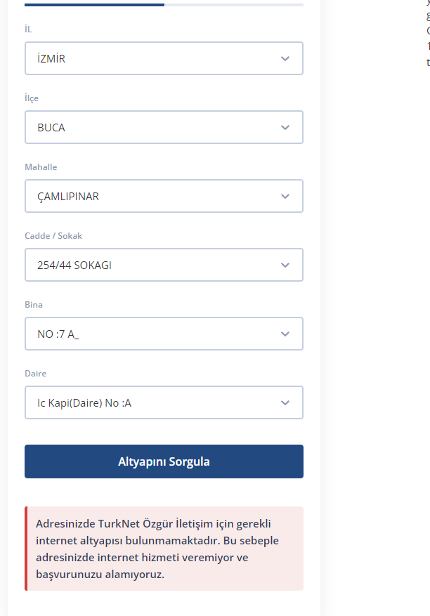 Aynı durum 1 yıldır mahallemde Türksat ve Superonline fiberleri için de mevcut. 6 sokak aşağıda otururken fiber alıyordum. Şu anki adreste yok. Altyapı desen var ama hizmet yok. Akıllara durgunluk resmen.
