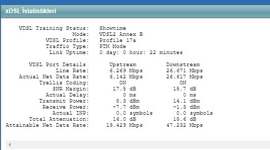Arkadaşlar internet hızım bir süredir düşük, kesilmeler falan oluyordu. Modem değiştirmemi söyledi TurkNet. Ben de değiştirdim ama derdime çare olmadı, defalarca talep oluşturdum sorunum çözülmedi. Her seferinde işlem yaptıklarını söylediler ama fayda etmedi. Sorun benden kaynaklı mı? Aşağıdaki değerlerden anlayabilir miyiz?