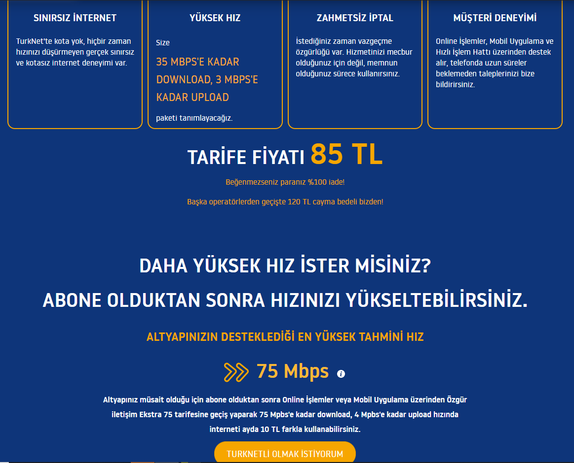 Selam ben 2 yıldır Türk Telekom kullanıyorum taahhüt sagülsun 110 TL veriyorum 24 Mbps internete oyunlarda fazlasıyla ping cıkıyor o yüzden farklı operatörler araştırırken TurkNet'i buldum altyapı sorgulamada 85 TL'ye 35 Mbps dowland 3 Mbps upload dedi 10 TL daha verirseniz 75'e kdr cıkar dedi dogru mudur 50'den aşagı düsermi bunu merak ettim simdiden teşekkürler.