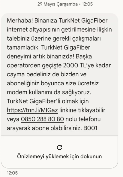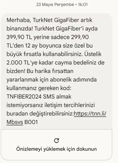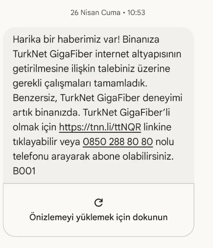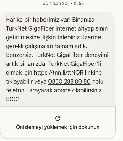 Aynı şey bana da geldi bir ara denemelik GigaFiber istiyorum başvurusu yapmıştım başka mahalleye linke tıkladım TurkNet'in resmi sitesi açıldı yani sahte mesaj değil zaten başvuru yaptığım mahalleyede GigaFiber gelmiş sahte değil.