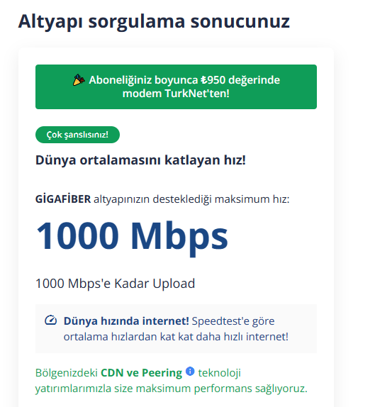 Binamın girişine 1 ay önce siyah bir TurkNet kutusu takıldı. Bugün hız için sorgulama yapınca bana 1000 Mbps internet verebileceklerini öğrendim. Tekrar daireme hat çektirmek ile uğraşmak istemiyorum doğrusu. Şu anda Türk Telekom'un fiber kablosuyla daireme uzun bir hat çektirdiğimden soruyorum.