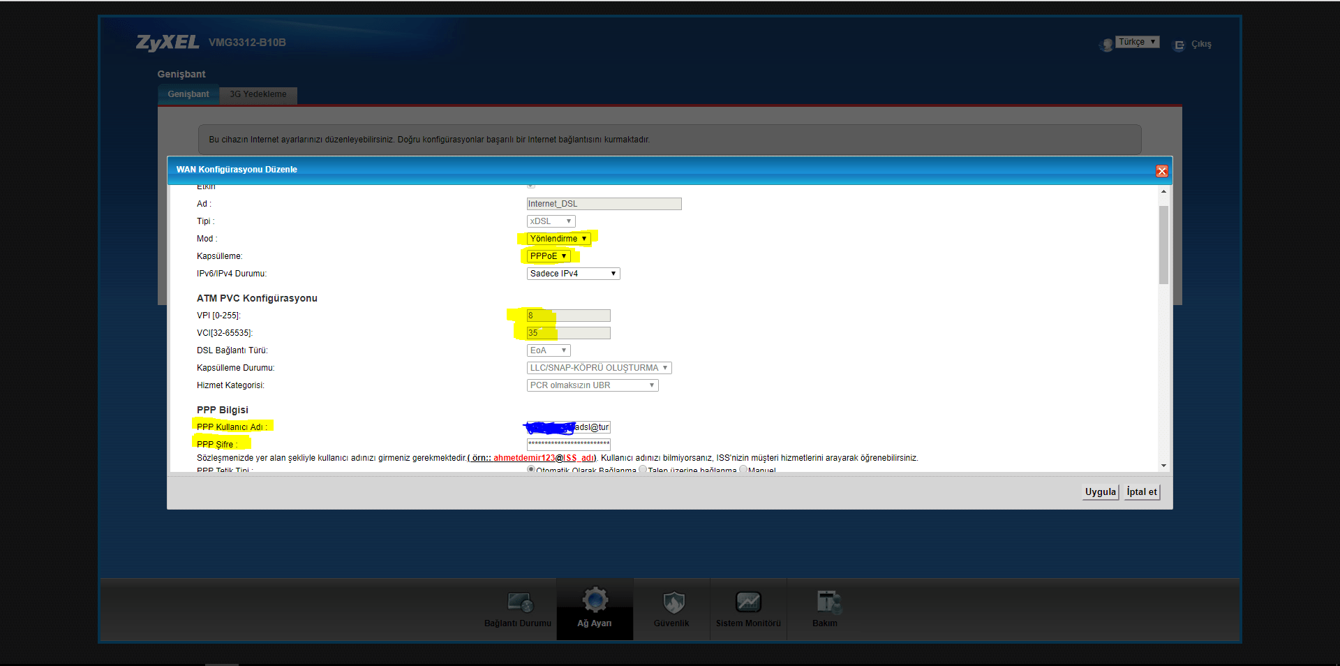 Benim modem ayarım :