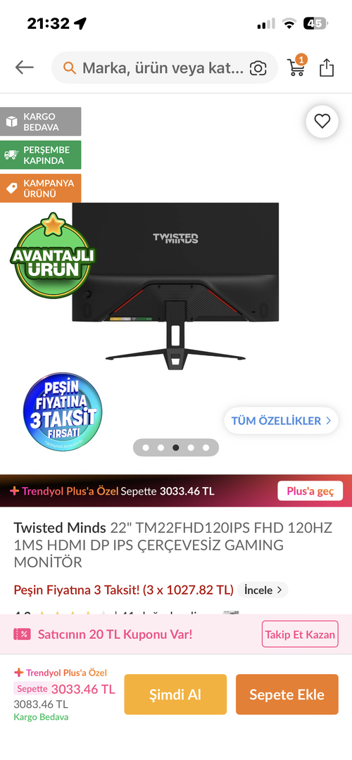 Öğrenciyim. Bütçem çok fazla değil. Yeni bir monitör almayı düşünüyorum. Twisted Minds'in bu monitörünü buldum. Çok da önemli değil benim için. Zaten 120 Hz monitör kadar bir monitör arıyordum. 1 ms de gayet benim için yeterli. Önceki kullandığım monitör 60 Hz'Ti. Bilgisayarımda zaten çok performanslı bilgisayar değil. Çok fazla da oyun için kullanmayacağım. Sadece Valorant, GTA, Minecraft tarzı oyunlar oynadığım için böyle bir monitör almayı tercih ettim. Çok fazla da bütçem yok. Önceki açtığım konuda bir hocamız da bana öneri yapmıştı. Ayrıca bu zamanlarda da çok fazla bu monitörü duyuyordum. Trendyol'da araştırdığım zaman fiyatı tam bana göreydi. Sizce alınır mı? Aşağıya link bıraktım.