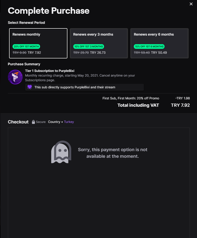 Merhaba. Twitch'te abonelik fiyatları düştü. Yeni fiyata abone olmak istiyorum fakat böyle bir hata veriyor. Yardımlarınızı bekliyorum teşekkürler.