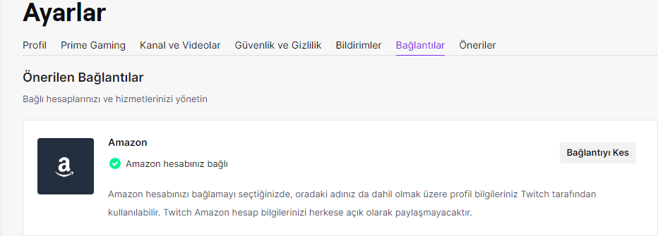 Bağlantılara baktığım da böyle gösteriyor e postayı göstermiyor Prime Gaming sekmesine tıkladım onda da e-posta göstermedi sadece bağlı olduğunu gösteriyor.