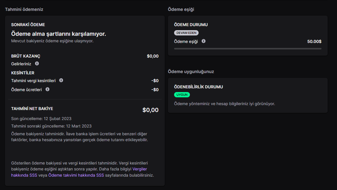 Arkadaşlar Twitch platformu "ödeme eşiği" ibaresinin altındaki barı her ayın son günü güncelleyip her ayın 12'sinde ödeme işlemi eğer minimum eşik olan 50$ doların üzerindeyse gerçekleştiriyor... Ödeme işlemi başlatıldığı tarihten itibaren belirtilen ödeme yöntemine göre değişiklik gösteriyor. Banka havalesi 1-3 iş günü içerisinde tamamlanıyor fakat banka havalesi yapılabilmesi için hesabınızda birikmiş minimum miktarın 100$ ve üzeri olması gerekli.
