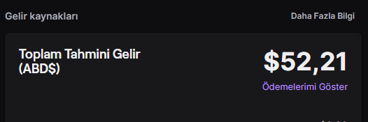 Merhaba. Twitch'te bir süredir yayın açmaktayım ve şu anda kazanç sayfasında 50,07 dolar gelirim gözüküyor.
