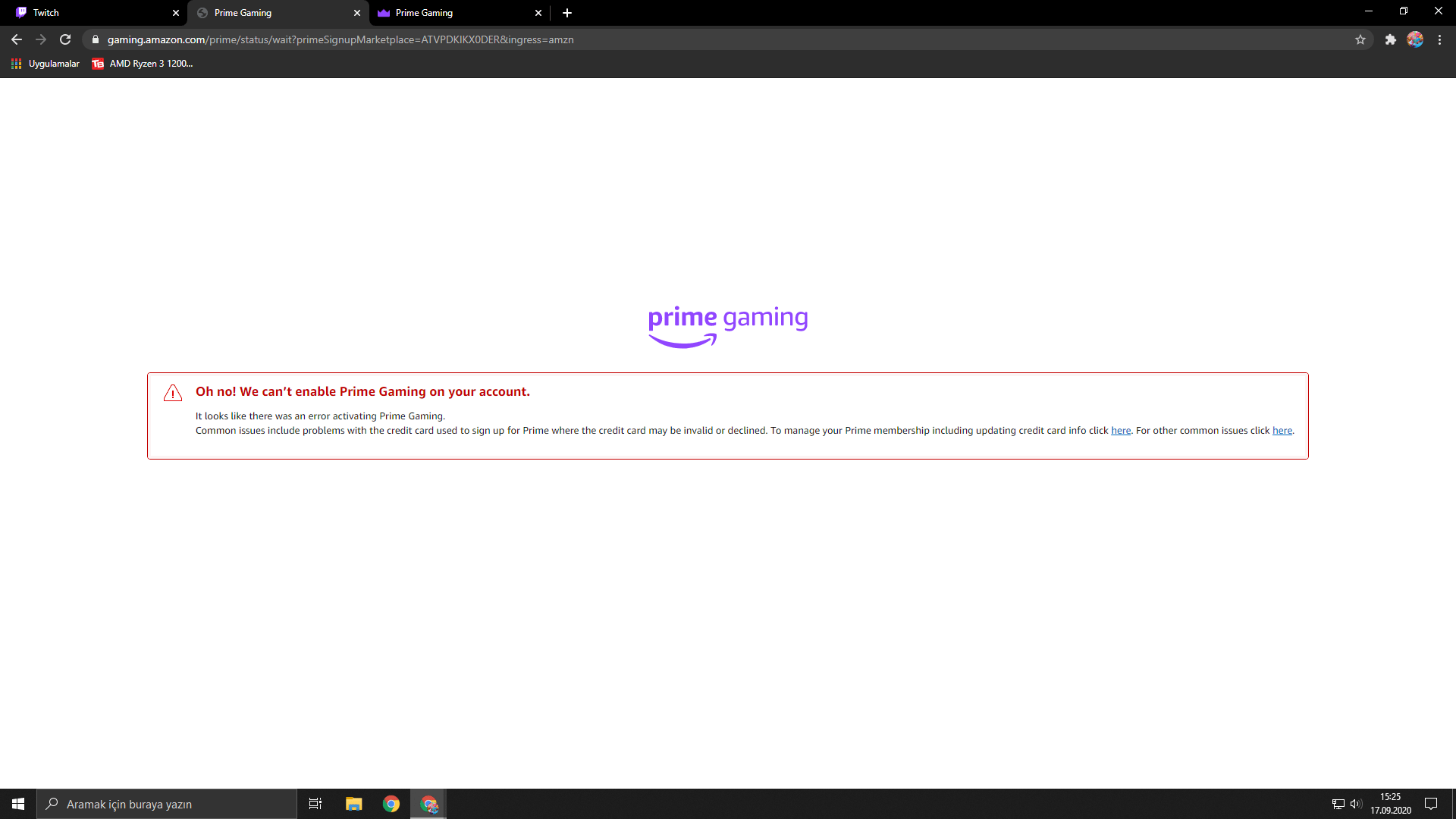 Kredi kartınız ya yanlış ya da içinde 2 dolar yok.Amazon'da Prime üyeliğim gözüküyor ve hesabım Twitch'le de bağlı ama bağlantı kurulamıyor. Bir türlü Twitch Prime yapamadım. Bu alttaki yazıyı gösteriyor her seferinde.